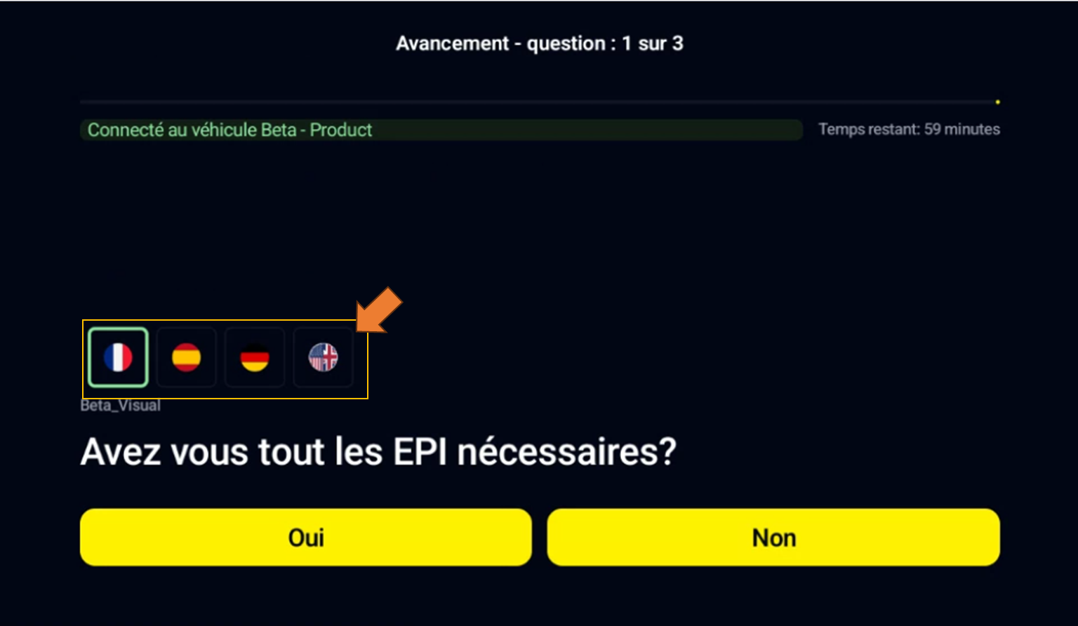 Sobald die Checkliste gespeichert und im Blaxtair-System gestartet wurde, werden Ihre Fragen genau in der Sprache angezeigt, die Sie eingegeben haben, auch wenn diese Sprache nicht eine der vier ursprünglich vorgeschlagenen war.