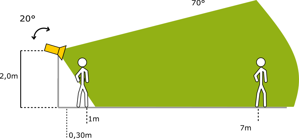 ¿Qué sucede durante el día para una longitud de detección más allá de 20 metros? La configuración con longitud superior a 20m (65.6ft) es posible ya que el sistema funciona correctamente, pero el rendimiento del sistema no está completamente caracterizado. La instalación requiere una verificación por parte del equipo de Blaxtair para asegurar un rendimiento nominal. 📧hotline@blaxtair.com | |