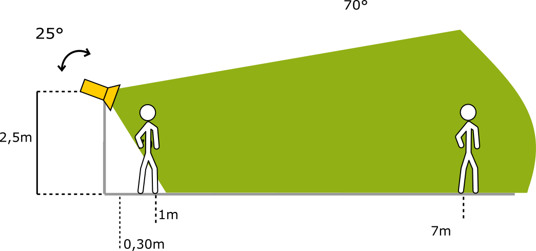 ¿Qué sucede durante la noche para una longitud de detección más allá de 10 metros? La configuración con longitud superior a 10m (32.8ft) es posible hasta 15m ya que el sistema funciona correctamente, pero el rendimiento del sistema no está completamente caracterizado. La instalación requiere una verificación por parte del equipo de Blaxtair para asegurar un rendimiento nominal. 📧hotline@blaxtair.com Después de 15m (49.2ft) el rendimiento no es suficiente. | |