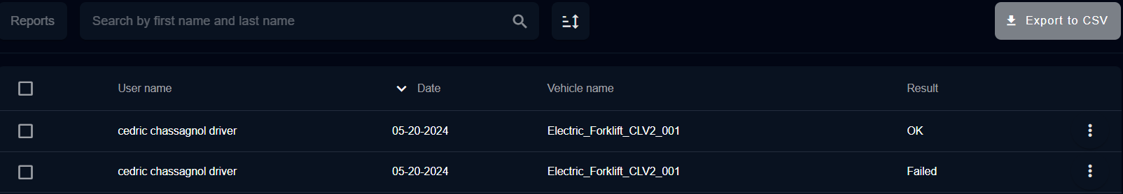 [Administrateur de l'entreprise] peut accéder à tous les rapports de checklist de sa flotte : les rapports ne seront disponibles que si le réseau est disponible autour des véhicules.